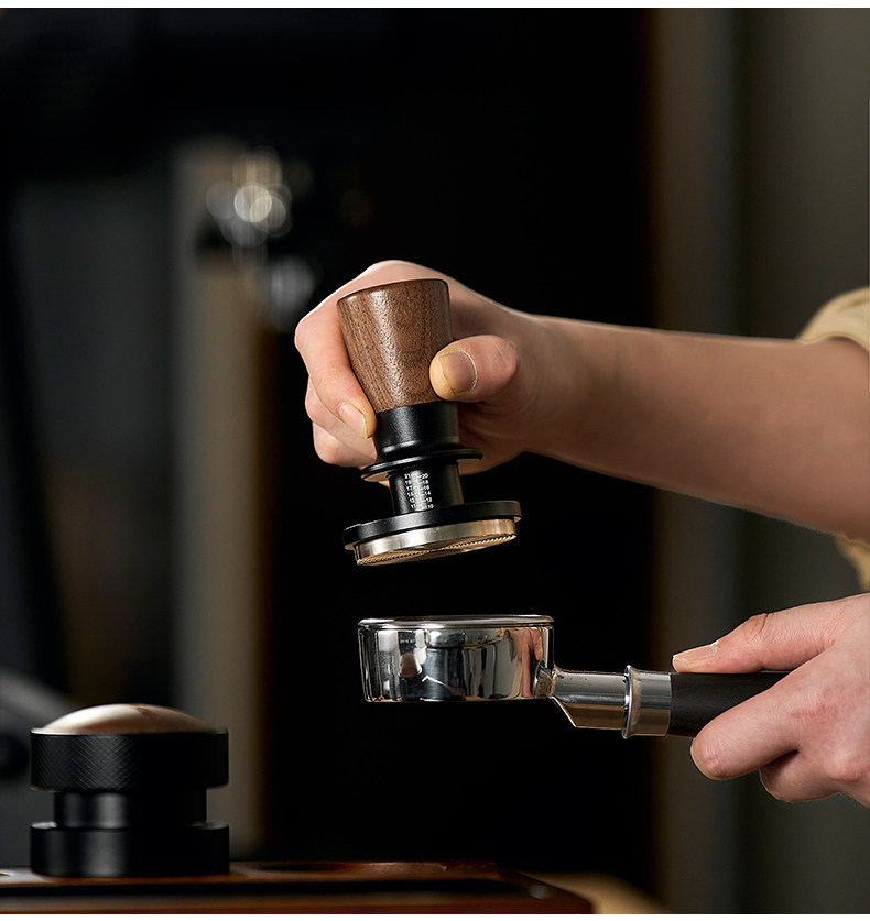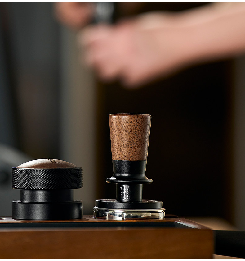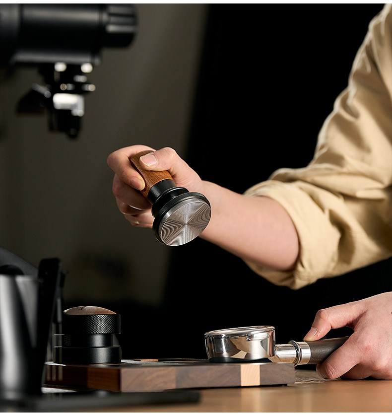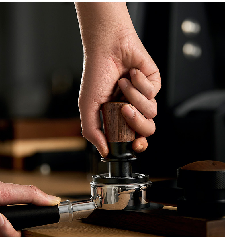 The Muyu Tamper channels the meditative precision of a wooden mallet — its spring-balanced mechanism delivers a consistent force with every press, paired with a warm walnut handle for an intuitive, satisfying feel.